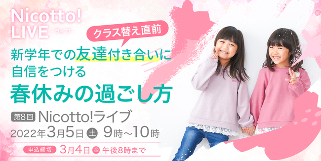 (株)パステルコミュニケーション(本社:豊島区)が運営する、発達障害・グレーゾーンの子どもを育てるママがいつでも学べて相談できる月額制会員サイトNicotto!塾は、進級進学によるクラス替えで我が子の友達関係が心配なママに向けて、春休みにおうちで社会性を伸ばす対応を学ぶオンラインライブを開催いたします。ライブの日程が3月5日9時-10時に決定いたしましたのでご案内いたします。