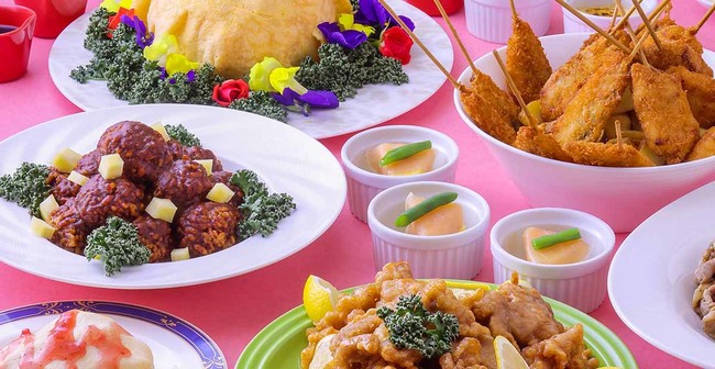 白身魚のソテー ココナッツミルクソース/蒸し鶏のレモンあんかけ/唐揚げ/オムライス/ミートボール/串カツ/ピザ/カレー/クレープ/ショートケーキ/冷やしぜんざいなど約25種※料理内容は食材の入荷状況により変更する場合がございます。予めご了承ください。