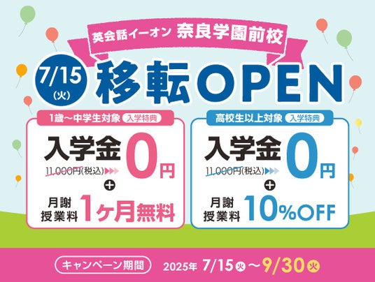 英会話教室を運営する株式会社イーオン(本社:東京都新宿区、代表取締役社長:重野卓、以下「イーオン」)は、2025年7月15日に現在の「イーオン学園前駅ビル校」を移転し「イーオン奈良学園前校」としてオープンいたします。