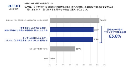 ごみ袋の有料化がされていない地域の生活者にごみ袋が有料化された場合の行動を質問したところ、31.5%がフリマアプリ・買取の利用、32.1%が回収BOXや寄付を利用すると回答し、6割以上が循環アクションを想定していることが明らかになりました。