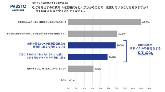 有料ごみ袋を購入する必要があると回答した地域の方は、意識していることとして無料の回収BOXや資源回収拠点を積極的に利用(29.3%)、リサイクルや寄付に回す(24.3%)と回答しており、 約5割が“捨てない選択”を実践していることが明らかになりました。