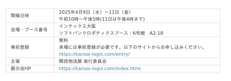 ソフトバンクロボティクス株式会社(本社:東京都港区、代表取締役社長 兼 CEO:冨澤 文秀)は、2025年4月9日(水)から11日(金)までインテックス大阪で開催される「第6回 関西物流展」に出展し、物流センターの自動化・全体最適化を実現するさまざまなソリューションを紹介します。