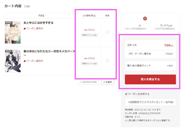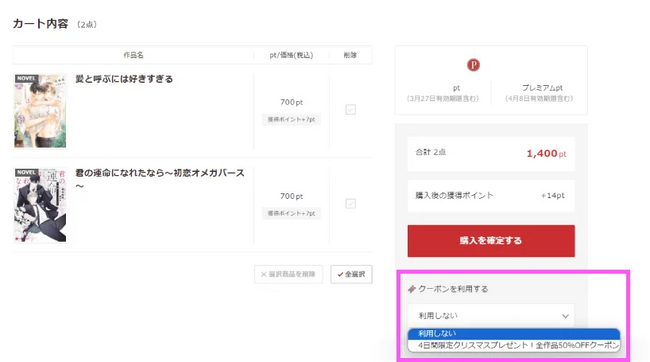 対象のクーポンを選択すると左の作品ポイントがクーポン適用後の状態に更新されます。