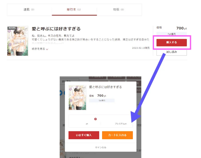 気になる作品のページから「購入する」をクリックし、「カートに入れる」を選択してください。