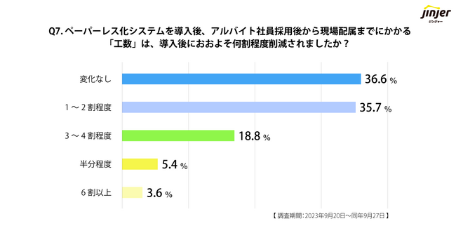また、「人事管理・雇用契約のシステムを導入後の工数の減少具合」について質問したところ、「変化なし」と回答したのは36.6%に留まり、全体の63.4%の人事担当者が工数の削減を感じているという結果になりました。また、削減した工数の割合として、最も多かった回答は「1~2割程度」でした。