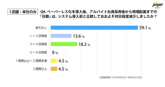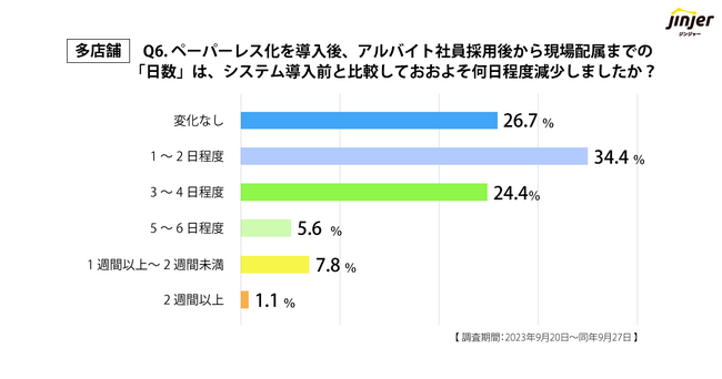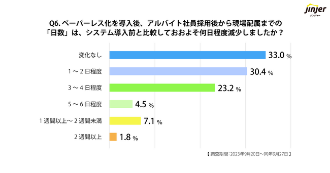 「人事管理・雇用契約のシステムを導入後の、アルバイト採用後から現場配属までの日数の減少具合」について質問したところ、「変化なし」と回答したのは全体の33%に留まり、67%が日数の減少を感じていることが明らかになりました。また、削減した日数として、最も多かった回答は「1~2日程度」でした。