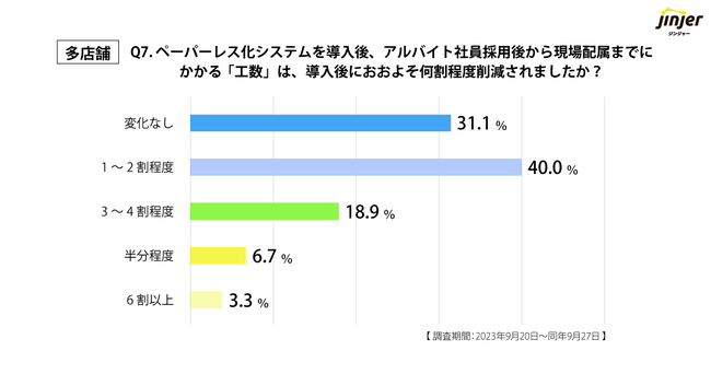 また、減少した工数に関しては、多店舗展開をおこなう企業の方が、1店舗のみ経営している企業に比べ28%効果があったとする回答が多く得られました。