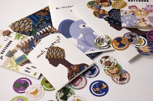 ▲バナナペーパーで作成した紙クリップ・ノート・シールなどのグッズ