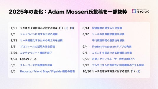 Instagram責任者Adam Mosseri氏の公式発言や最新のアルゴリズム仕様に基づき、フィード・リール・ストーリーズごとの攻略法、実践的な投稿戦略、2025年話題の投稿事例まで、実務で即使える情報を体系的にまとめています。