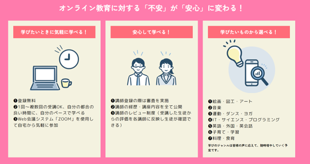 MyTeacherでは誰もが気軽に学べるよう、登録料は無料、講座料金は1回あたり1,000円と低価格に設定し、従来の習い事教室より料金を気にせず受講することが可能です。また1回~複数回と受講回数に制限がないため、自分のペースに合わせて学習ができます。講座はWeb会議システム「Zoom」を使用しオンラインで開催するため、場所を問わず自宅や外出先からでも受講が可能です。すべてオンライン講座のため、子供の送迎等も発生せず、子供・大人ともに負担軽減につながり、気軽に学びを得ることができます。