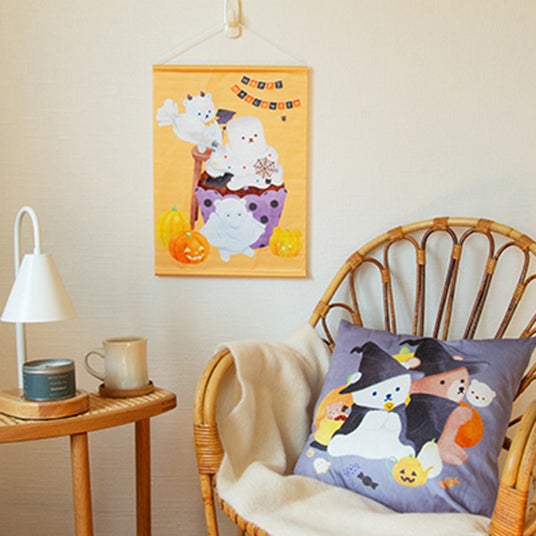 部屋にあるだけでその場が華やぐ、タペストリーにスクエアクッション、アクリルスタンド&ブロック。ふと目に入ったとき、その可愛さにキュン!となる、アクリルマグネットにハンドタオル、てぬぐい。それから、毎日の活躍間違いなしの、円形鍋敷き。年々盛り上がるハロウィンですが、お家でハロウィンを楽しみたい方も多いはず。そんな方にこそぜひお届けしたいアイテムです。