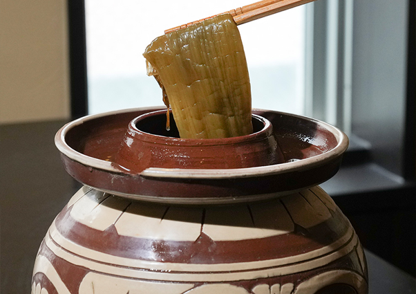 中国から輸入した高菜と青唐辛子の漬物を、菊島シェフが塩と水で漬けなおしています。すっぱい古漬けにすることで、鍋で煮込んだ時に漬物から塩味と酸味がつゆに染み出します。