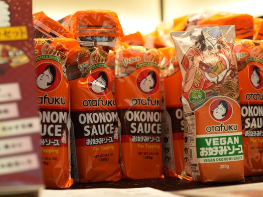 オタフクソース株式会社様ブース。自国でも日本食を楽しみたいと思っている訪日外国人観光客をターゲットとしたヴィーガンのお好みソースなどをご紹介いただきました。