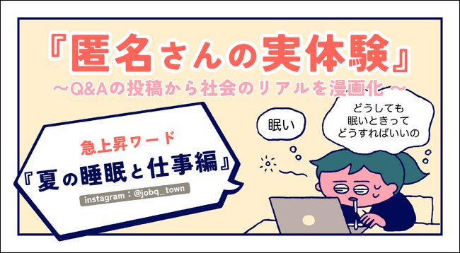 株式会社ライボ(本社:東京都渋谷区 代表取締役:森 宏記 以下「ライボ」)が運営するキャリアや就転職に特化した匿名相談サービス『JobQ Town(ジョブキュータウン)(※1)』(以下JobQ Town)にて、アクセスワードを調査した結果、「夏の睡眠と仕事」に関するQ&A(※2)投稿へのアクセスが急上昇していることをお知らせします。この急上昇ワードを漫画化したものを、Instagramアカウント「匿名さんの実体験(※3)」にて同時公開しています。