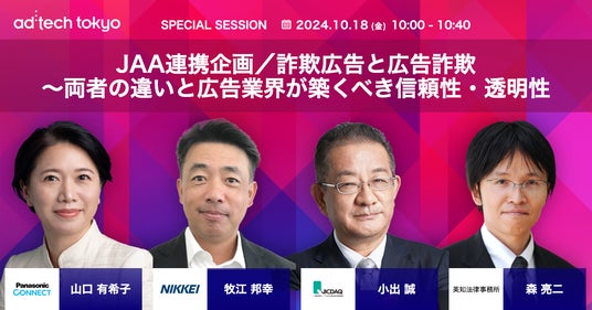 マーケティングの国際カンファレンスを多数企画・実施しているComexposium Japan (コムエクスポジアム・ジャパン)株式会社(東京都港区、代表取締役社長:古市優子)は、2024年10月16日(水)~18日(金)に東京ミッドタウン&ザ・リッツ・カールトン東京で行われる「ad:tech tokyo (アドテック東京)」にて、公益社団法人 日本アドバタイザーズ協会(JAA)と連携し、近年社会問題化している「詐欺広告」そして、広告業界の課題でもある「広告詐欺」に関するスペシャルセッションを実施することを発表します。