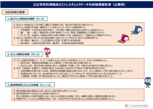 全国の公立小・中・高等学校の教職員が加入する「公立学校共済組合」は、教職員のストレス状況とその要因を明らかにしメンタルヘルス対策事業に役立てることを目的として「ストレスチェックデータ分析結果報告書」(2024年7月26日公表)を公開しています。