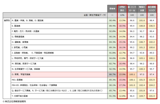 ストレスチェック業界平均値レポート2025:受検率・高ストレス者割合・総合健康リスク業界別一覧「教育, 学習支援業」