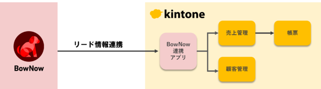 『BowNow』で取得したマーケティング情報が、「BowNow連携アプリ」を経由して『kintone』に引き継がれることで、『kintone』内での売上情報や顧客情報などの管理が可能となります。