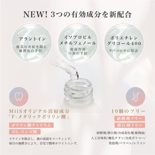 「オーラルケアからオーラル美容に」というMiiSの想いを反映し、毎日のオーラル美容がワクワクする瞬間になるように、見た目だけでなく、成分にも徹底的にこだわり続けた商品です。