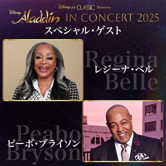 そして、アカデミー賞(R)最優秀主題歌賞に輝いた、本作品のエンドソングの「ホール・ニュー・ワールド」を歌唱したピーボ・ブライソンとレジーナ・ベルがアメリカから2人そろって来日!オリジナル・デュオによる貴重なパフォーマンスもお見逃しなく!
