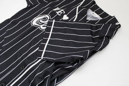 「WE(ハート)CATS」が胸にプリントされたベースボールユニフォームシャツ。