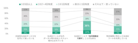 また、生成AIを日常的に活用しているが、1日に複数回活用するような積極的な活用層は約21%と、生成AIが導入されていてもビジネスシーンにおける利用定着に関しては、未だ課題として残っていることがわかりました。