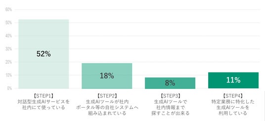 一方で、「社内情報との連携」「特定業務に特化した生成AI適用」といったより高度な活用まで進んでいる企業は少数であり、業務での本格活用はこれからであることが明らかになりました。