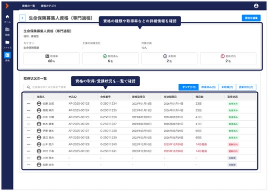 本機能は、保険代理店における募集人資格・研修・更新管理を一元化し、法令遵守(コンプライアンス)と人材育成の両面を強力に支援するものです。資格情報を社員単位・保険会社単位で統合的に可視化することで、複雑化する態勢整備業務の負荷を軽減し、組織全体の人的ガバナンスの高度化を推進します。