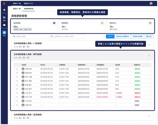 - 資格切れ防止の管理者向けアラート強化全社・拠点・チーム単位で更新遅延リスクを俯瞰できる管理ダッシュボードを拡張予定。組織全体のガバナンス強化に直結します。
