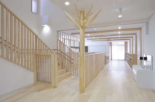 〇随所に木材を使用し、木の温もり・香りに包まれた健康的な空間作りを目指した園舎である。