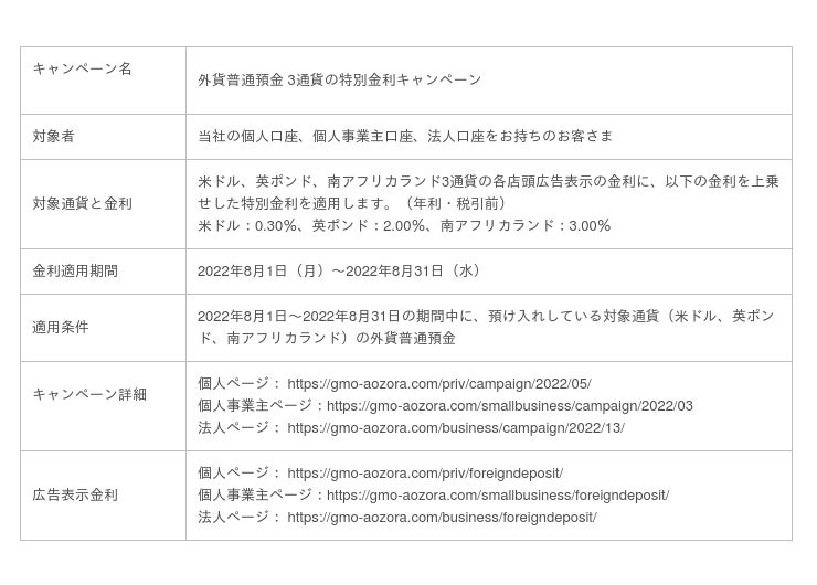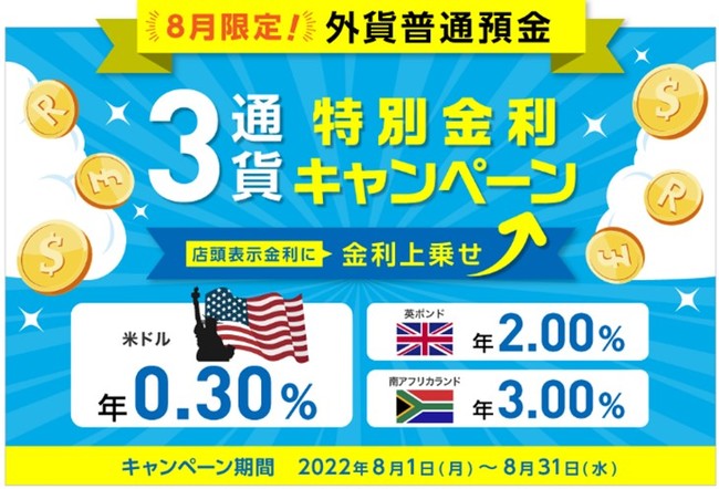 GMOあおぞらネット銀行株式会社(以下、当社)は、本日2022年8月1日から2022年8月31日までの期間限定で、外貨普通預金の3通貨(米ドル、英ポンド、南アフリカランド)金利を店頭表示金利に上乗せして提供いたします。