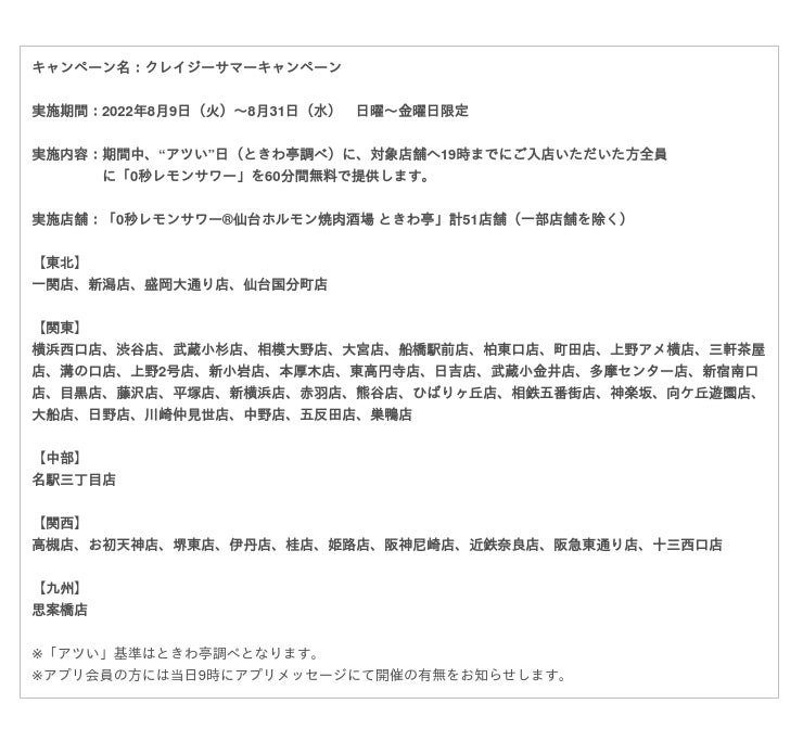 この度、開催する『クレイジーサマーキャンペーン』は、猛暑厳しい今夏を「0秒レモンサワー」で愉しく吹き飛ばしていただきたいと企画いたしました。期間中、19時までに入店されたお客様全員に、“アツい”日(ときわ亭調べ)は「0秒レモンサワー」60分500円(税込)を無料で提供いたします。なお、アプリ会員の方には朝9時にアプリメッセージにて事前に通知します。