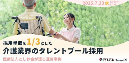 株式会社TalentX(本社:東京都新宿区、代表取締役社長:鈴木 貴史、証券コード:330A、以下「TalentX」)は、医療法人としわ会(本部:愛知県名古屋市、理事長:清水 秀康、以下「としわ会」)をゲストにお招きし、「採用単価を1/3にした介護業界のタレントプール採用」をテーマにした採用マーケティングセミナーを7月23日(水)に開催いたします。