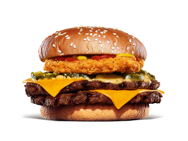 『チーズ&チキン ビッグマウスバーガー』は、直火焼きの100%ビーフパティ2枚の上にジューシーなチキンパティ、コクのあるチーズソース、チェダーチーズスライスを重ね、ケチャップとマスタードで仕上げた、ボリューム満点の本格大型バーガーです。