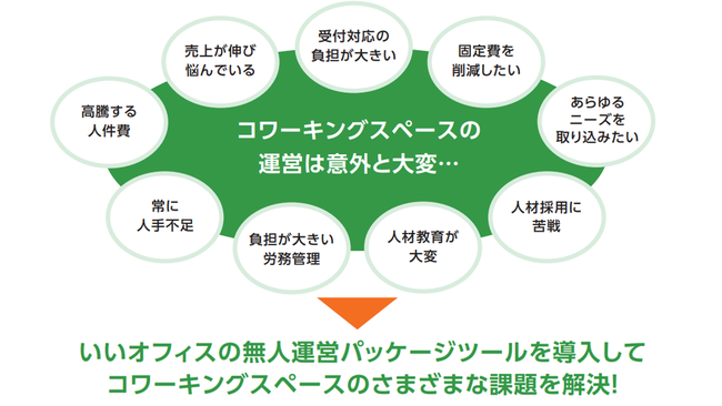 全国47都道府県に800店舗以上のコワーキングスペースを展開する株式会社いいオフィス(本社:東京都港区、代表取締役:龍崎 宏 以下、「いいオフィス」)は、コワーキングスペースにおける固定費削減と売上向上をサポートすることを目的に、無人運営パッケージをリリースしたことをお知らせします。