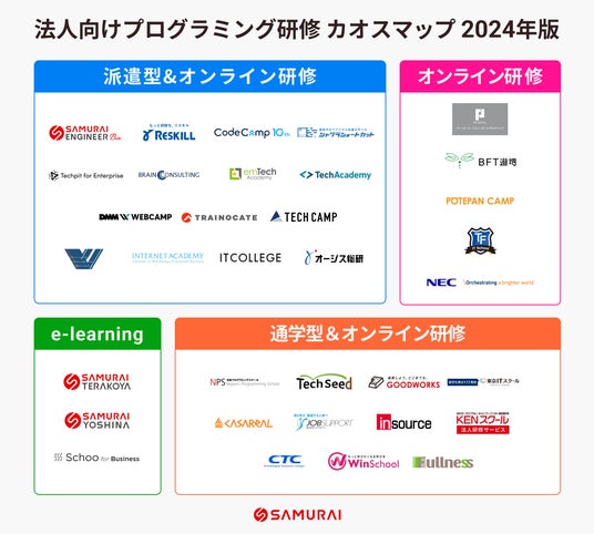 「質の高いIT教育を、すべての人に」をミッションに、4万5,000名以上の受講生を指導してきたプログラミングスクール「侍エンジニア」を運営する株式会社SAMURAIは、『2024年版プログラミング法人研修カオスマップ』を公開しました。