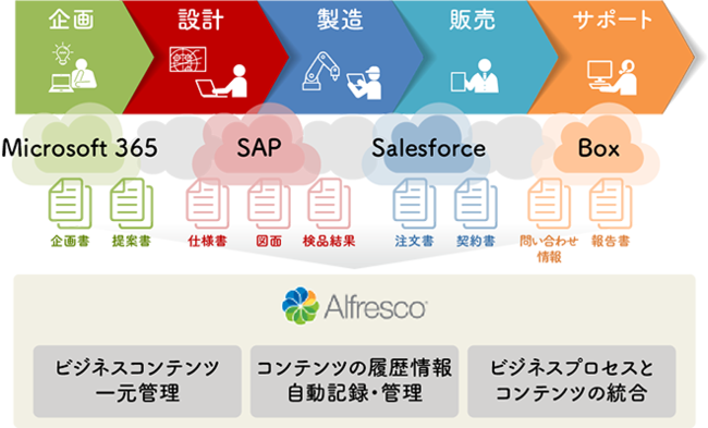 グローバルサプライチェーンの業務システムとして複数のクラウドサービスを利用する機会が増え、コンテンツ作成から廃棄まで一貫した管理や更新履歴の記録など、法規制を含めた情報ガバナンスへの対応が複雑化し、新たな課題となっています。Alfresco CloudとAlfresco Digital Business Platformは、オープンソースベースで拡張性と柔軟性に優れ、業務で用いられるSAPやSalesforce、Microsoft 365、Boxなどのさまざまなクラウドサービスと連携して、作成されたコンテンツを一元管理し、ビジネスプロセスも統合的に管理できます。また、編集や廃棄といった履歴情報を、米国のデジタル記録管理標準DoD5015.02*1 などのデータ保護に関する法規制対応に適した形で記録することで、企業の情報ガバナンスを強化できます。