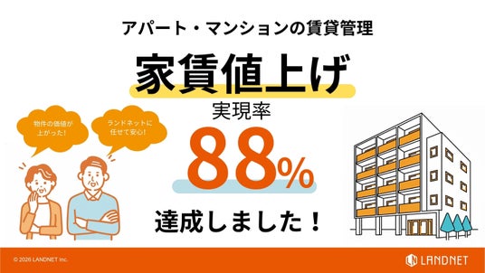最新のテクノロジーと独自のデータベースを活用した「ダイレクト不動産」を実現し、不動産の流通、再生、運用に新たな価値を提供する株式会社ランドネット(本社:東京都豊島区/代表取締役社長:榮 章博、証券コード:2991、以下ランドネット)は、管理物件の賃貸借契約更新時において、家賃値上げ実現率88%を達成したことをお知らせいたします。