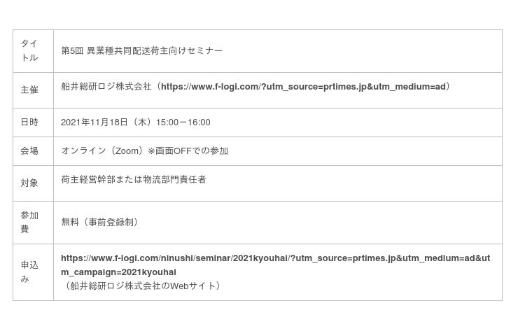 ロジスティクス・物流コンサルティングサービスを提供する船井総研ロジ株式会社(本社:東京都千代田区、代表:菅重宏、以下「船井総研ロジ」)は、2021年11月18日(木)15:00-16:00、共同配送への参画を検討中の荷主企業を対象にした「第5回 異業種共同配送荷主向けセミナー」を開催します。