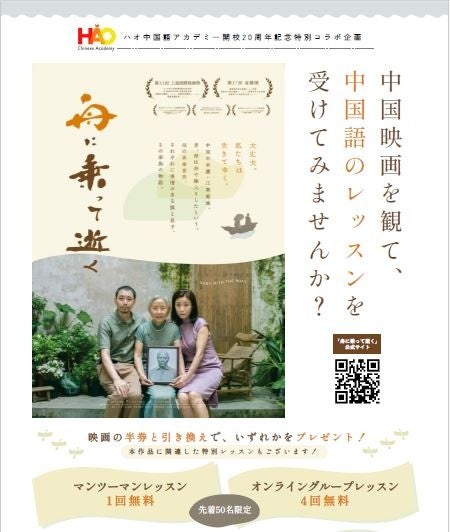 2025年6月13日(金)より公開される『舟に乗って逝く』を映画館でご覧になり、映画半券および座席指定券・入場QRコードなど映画ご鑑賞を証明するものをハオ中国語アカデミーの学校にお持ちいただくことで、先着50名様にハオ中国語アカデミーのマンツーマンレッスン1回もしくはオンライングループレッスン4回を無料でプレゼントいたします。