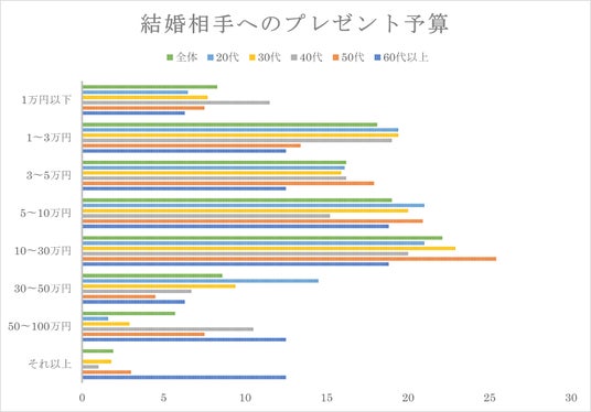 「10~30万円」が全世代で最も支持される一方、若い世代では現実的な価格帯の「1~3万円」(16.7%)が2位となるほか、40代も同金額が2位に選ばれていますが、40代以上からは「50万円以上」を選ぶ割合が増えるなど、幅広い予算感が特徴的です。