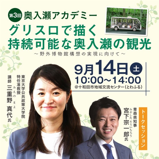 当日は、グリーンスローモビリティの特性や、他の活用事例、世界の観光・交通のトレンド、持続可能な観光、奥入瀬の未来について伺うことができるほか、今年奥入瀬で実施する自動運転の取組発信なども行います。