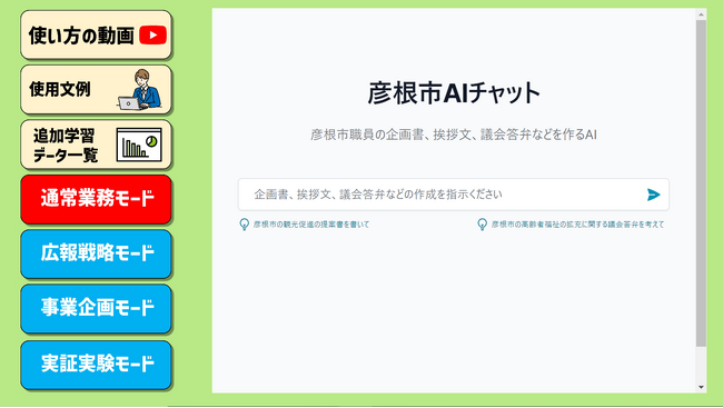 彦根市専用に必要な情報を学習させた「彦根市AIチャット」を彦根市職員の皆様に試験的にご利用頂き、その効果を検証するとともに実証実験の期間中、回答できなかった質問への対応、学習内容の修正と追加を行って内容を更新してまいります。