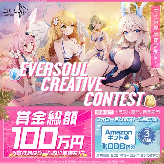 株式会社カカオゲームズは、2024年8月23日(金)にスマートフォン向け新作アプリ『エバーソウル』において、賞金総額100万円の「EVERSOUL CREATIVE CONTEST」を開始しました。「イラスト部門」「音楽部門」からお好きな方、または両方に参加することができます。最優秀賞(最大5作品)に選ばれると賞金の他、応募作品がゲーム内に実装される可能性もありますので奮ってご参加ください。