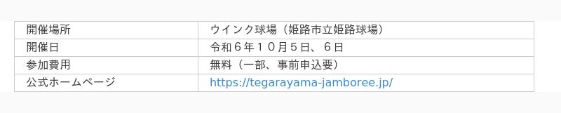 「ウインク球場リニューアル記念事業in姫路」実行委員会は、手柄山 AUTUMN JAMBOREE(オータムジャンボリー)を令和6年10月5、6日に開催します。このイベントは、ナイター照明やLED大型モニターを設置し、リニューアルしたウインク球場において、スポーツと文化、芸術の融合をコンセプトとした市民参画イベントとなります。