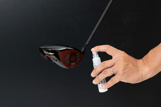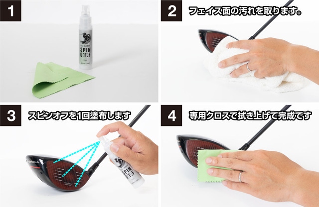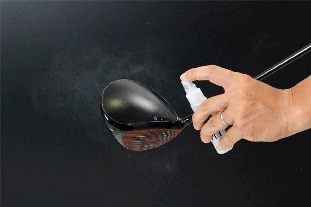 使い方は簡単!「ビッグキャリースピンオフ」をドライバーのフェイス面にシュッとひと吹きし、付属のクロスで馴染ますようにさっと拭きます。