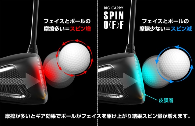 「ビッグキャリースピンオフ」をドライバーのフェイス面に塗布することで、表面に極めて薄い被膜を作ります。この被膜があることで、ドライバーにボールが当たる瞬間の摩擦係数を減らす効果があるのです!
