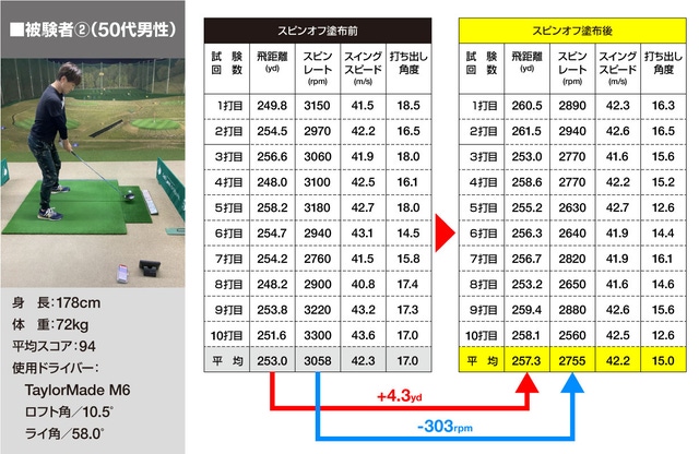 被験者2.結果:平均飛距離が約4.3yd上がり、スピン量は平均約303回転抑えることが出来ました。