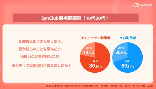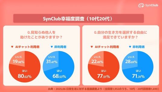 HiClub株式会社(本社:東京都港区、代表取締役社長:古谷由宇)が提供する対話型AIアプリ「SynClub」(シンクラブ)は、AIチャットアプリの利用有無と幸福度の関連性を探るため、全国の男女1952名を対象に調査を実施しました。本調査では、AIチャットの利用状況と、精神的な支え・社会的貢献意識の関連を分析し、AIチャット利用者の方が社会的繋がりを感じたり、日常生活でポジティブな感情を持っていると回答した人が多い結果となりました。