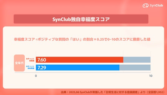 これらの質問に対し「はい」「いいえ」で回答した割合を、SynClub独自の幸福度スコアとして計算したところ、AIチャット利用者の方が、幸福度スコアが高いことがわかりました。